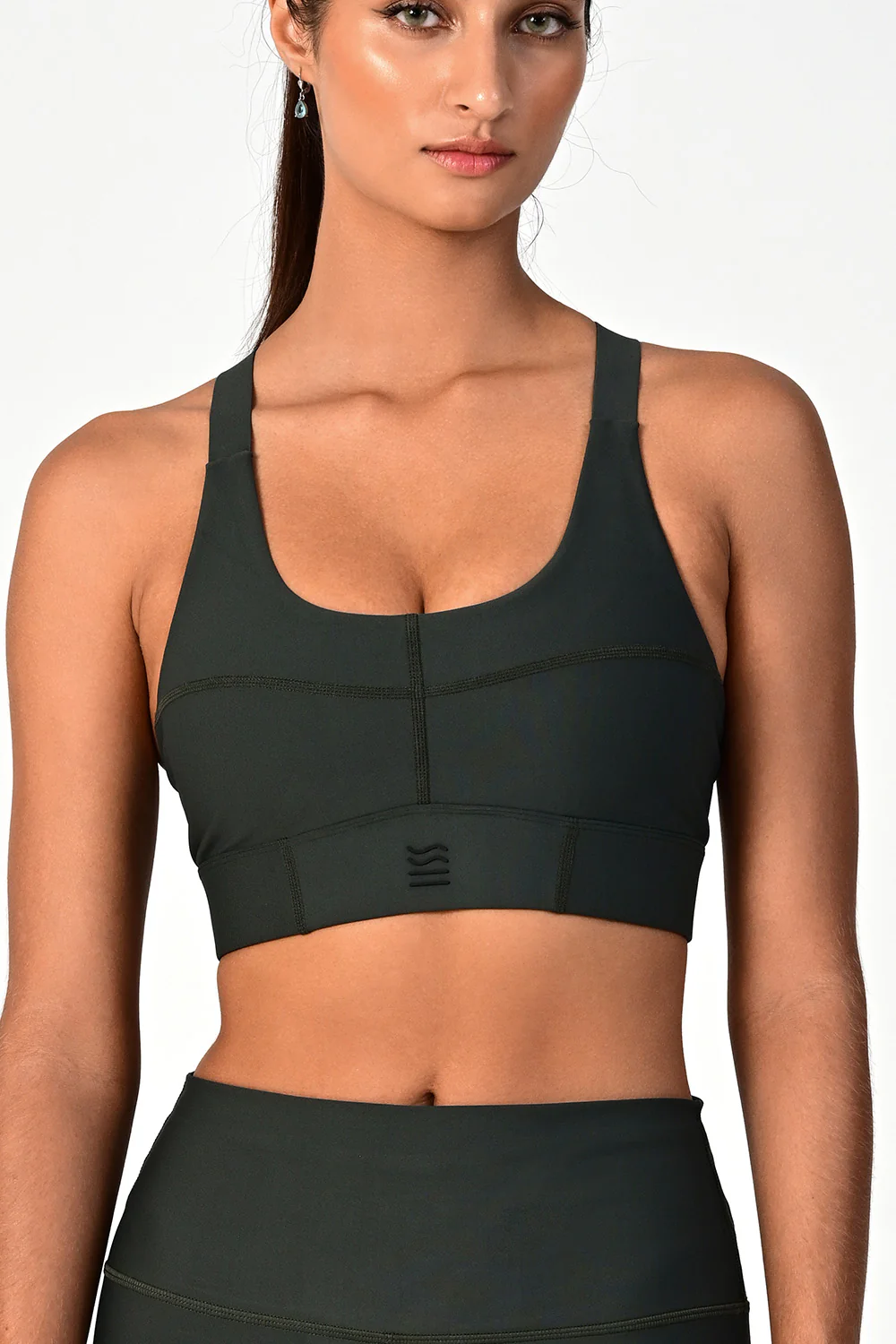 Introducing the Soho Olive Activewear Set featuring the Soho Active Bra and Soho Active Leggings. The bra offers maximum support with three layers of fabric, removable padding, and adjustable straps, perfect for intense workouts. The leggings are made from durable, non-see-through, sustainable materials, featuring moisture-wicking technology, UPF 50+ sun protection, and a hidden key pocket. Both pieces provide 4-way stretch for improved movement and are certified to the Oeko Tex Standard 100